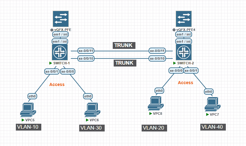 xe-0/0/10→ Allow all VLANsxe-0/0/11→ Allow VLANs 10, 20, and 40
